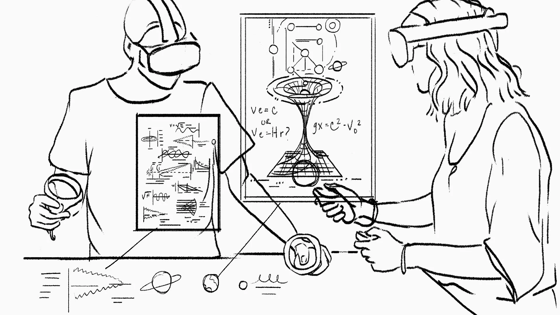 To make the composition more collaborative, I added a second subject and illustrated the two individuals working together in a virtual space. I replaced all elementary content with more advanced concepts like physics, biology and chemistry.